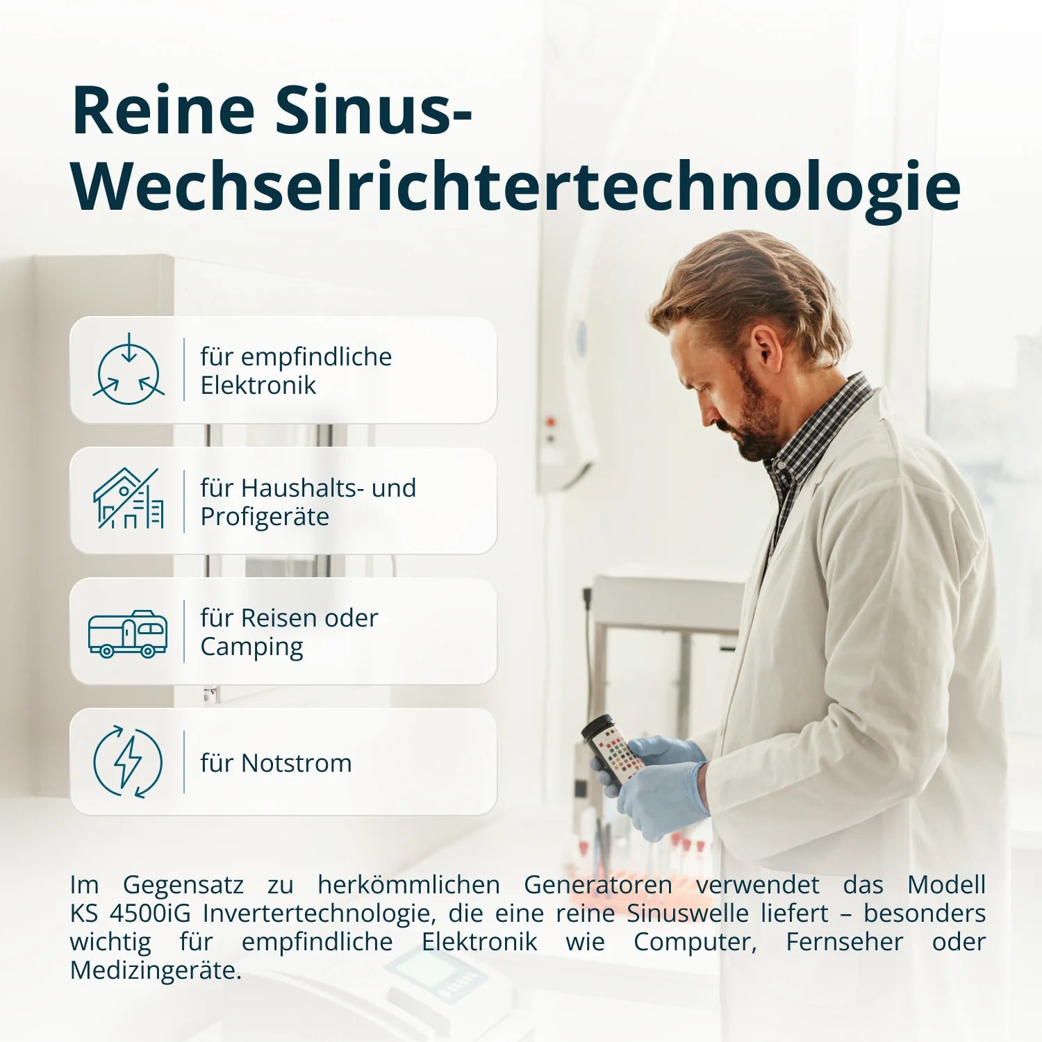 Reine Sinuswelle – Sicherer Betrieb empfindlicher Elektronik (Computer, Medizingeräte) dank stabiler 230V/50Hz Spannung.