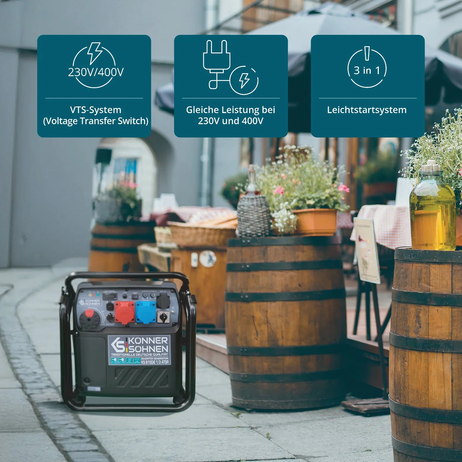 "Könner & Söhnen" Inverter Generator KS 8100iE 1/3 ATSR - 8kW Rated Power (230/400V available without switching losses) - Petrol Engine