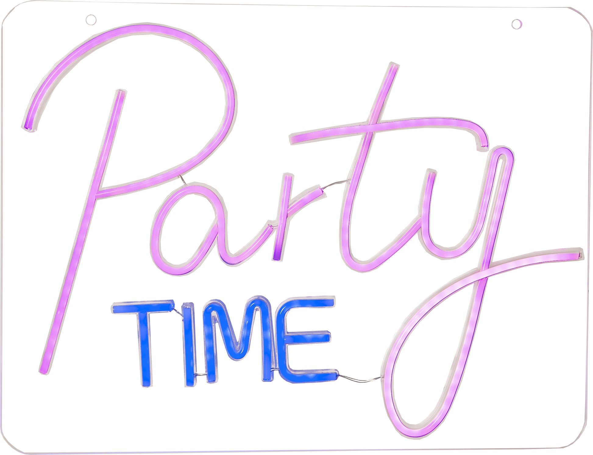 Coole Wanddekoration für den Innenbereich mit Party Time Schild. Transparente Plexiglasplatte mit LED-Licht in rosa und blau. Das Produkt hat einen USB-Stecker.