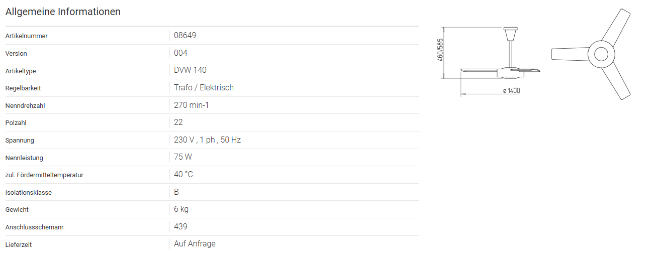 Robuste Metallausführung in klassischem Design. Wartungs- und funkstörfreier geschlossener Motor für Dauerbetrieb gegeignet, weiß einbrennlackiert. Schwingungsdämpfende Aufhängung für vibrationsarmen Lauf. Einfache Montage durch vormontierte Lieferung: es sind nur noch die drei Laufradblätter anzuschrauben. Variable Abhängehöhe durch Lieferung eines kurzen und eines langen Pendelrohres. Drehzahlsteuerbar mit 5-Stufen-Drehzahlsteller TSW 0,3 (Zubehör). TÜV GS geprüft. Die Unfallverhütungsvorschriften (UVV) geben zwingend einen Mindestabstand von 2,3 m vom Fußboden bis zur Flügelunterkante vor. Absturzsicherung mit Fangseilnach DIN EN 60335-2-80. Luftförderrichtung reversierbar. Strömungsrichtung zum Boden oder zur Decke durch Festanschluss oder mittels Wendeschalter (Zubehör DSEL 2) festlegbar. Bei Reversierbetrieb (Luftförderrichtung nach oben) Mindestanlaufspannung von 100 V erforderlich.