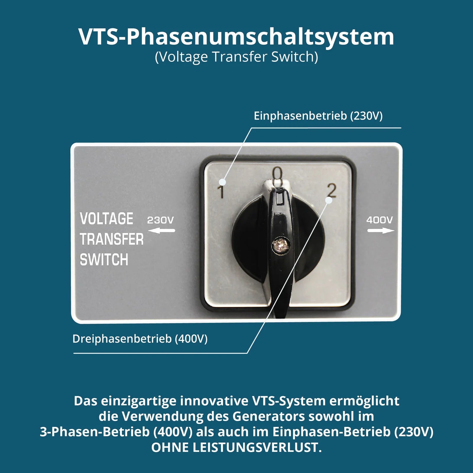 Mit dem einzigartigen, innovativen Phasen-Umschaltungssystem VTS (Voltage Transfer Switch) kann der Generator sowohl im dreiphasigen Betrieb (400V), als auch im einphasigen Betrieb (230V) ohne Leistungsverlust verwendet werden. Man braucht nicht mehrere Generatoren zu kaufen, zu lagern, zu bedienen und zum Objekt zu befördern. Man kann einfach den Arbeitsbetrieb umschalten und den Generator „Könner&Söhnen“ mit dem Phasen-Umschaltungssystem bei gewünschter Spannung verwenden.