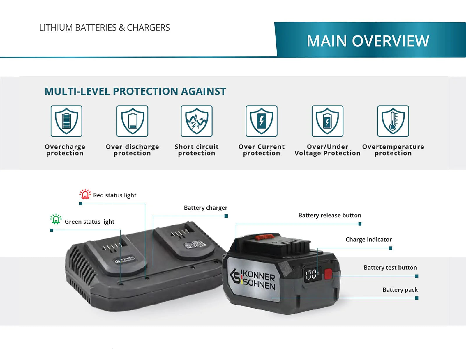Moderne Lithium-Ionen-Batterien von Könner & Söhnen® sind sehr zuverlässig und langlebig. Ihre Lebensdauer ist dreimal so lang wie die von Blei-Säure-Batterien. Sie sind leicht und kompakt, haben jedoch gleichzeitig eine hohe Batteriekapazität und sind über die gesamte Lebensdauer wartungsfrei. Zudem sind sie mit dem höchsten Schutzklasse ausgestattet und verfügen über eine Ladezustandsanzeige.