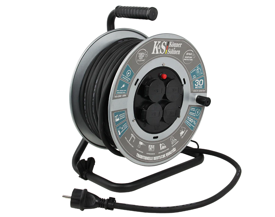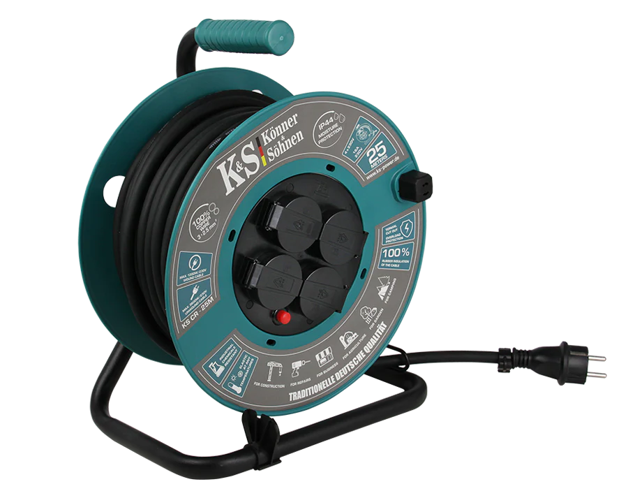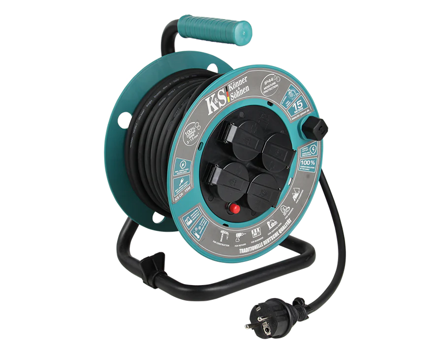 Das gummierte Verlängerungskabel ist vollständig vor Feuchtigkeit, industriellen und landwirtschaftlichen Chemikalien, Sonnenlicht und festen Partikeln geschützt. Es behält seine Elastizität bei allen Temperaturen und ist daher zu jeder Jahreszeit für den Einsatz im Innen- und Außenbereich geeignet. Die Steckdosen der Kabeltrommel sind mit den Schutzkappen ausgestattet.