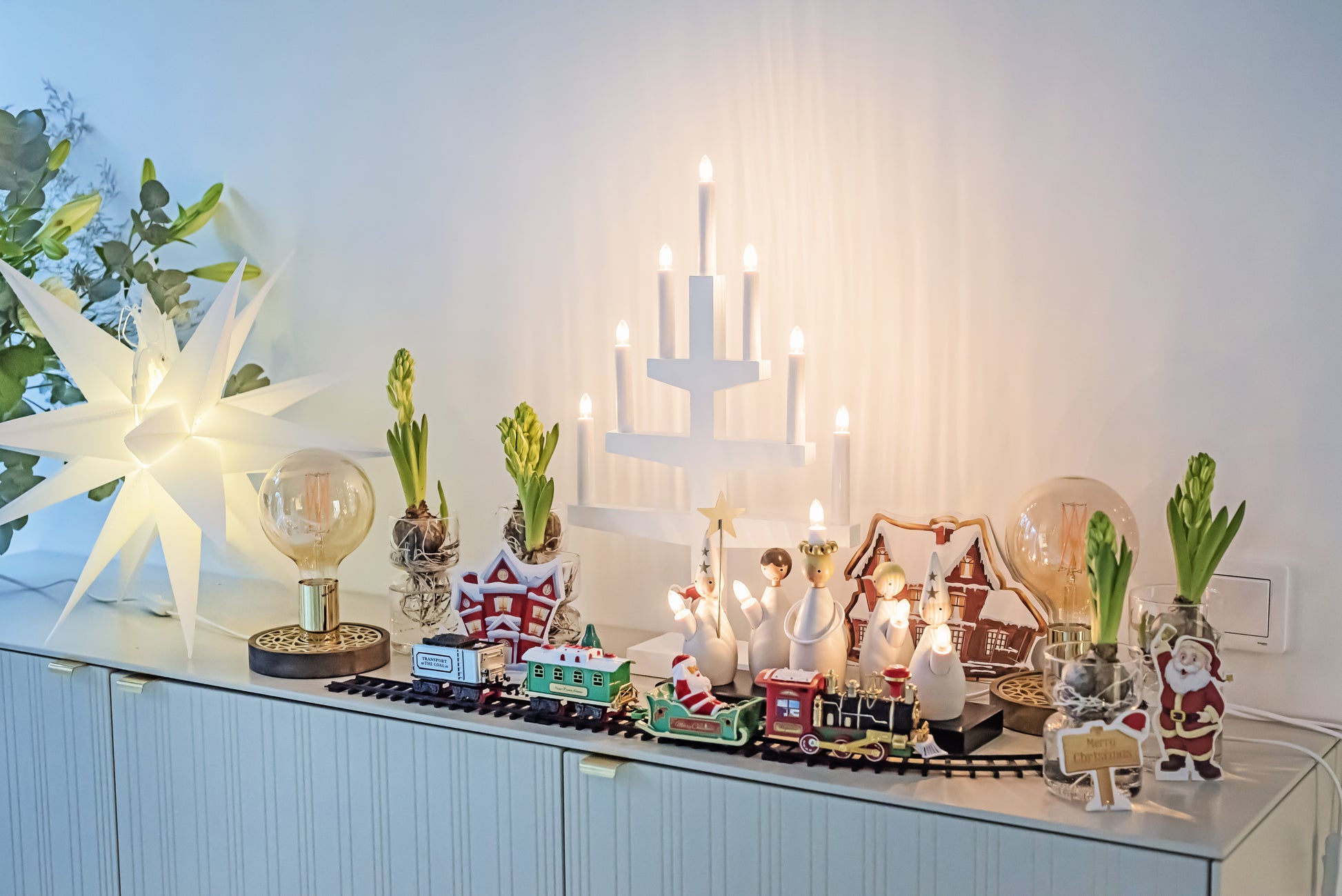 Klassischer Lucia-Zug in Form eines Adventsleuchters aus Holz. Dekorieren Sie für Lucia und Advent, der Kerzenhalter gibt eine fantastische Weihnachtsatmosphäre in einem Fenstern und auf einer Anrichte.