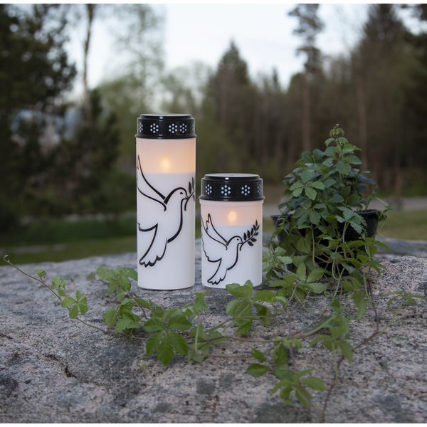12 cm große Grabkerze mit aufgedrucktem Muster in Form einer fliegenden Taube. Extra lange Lebensdauer; 2500 Stunden und mit einem integriertem Timer.