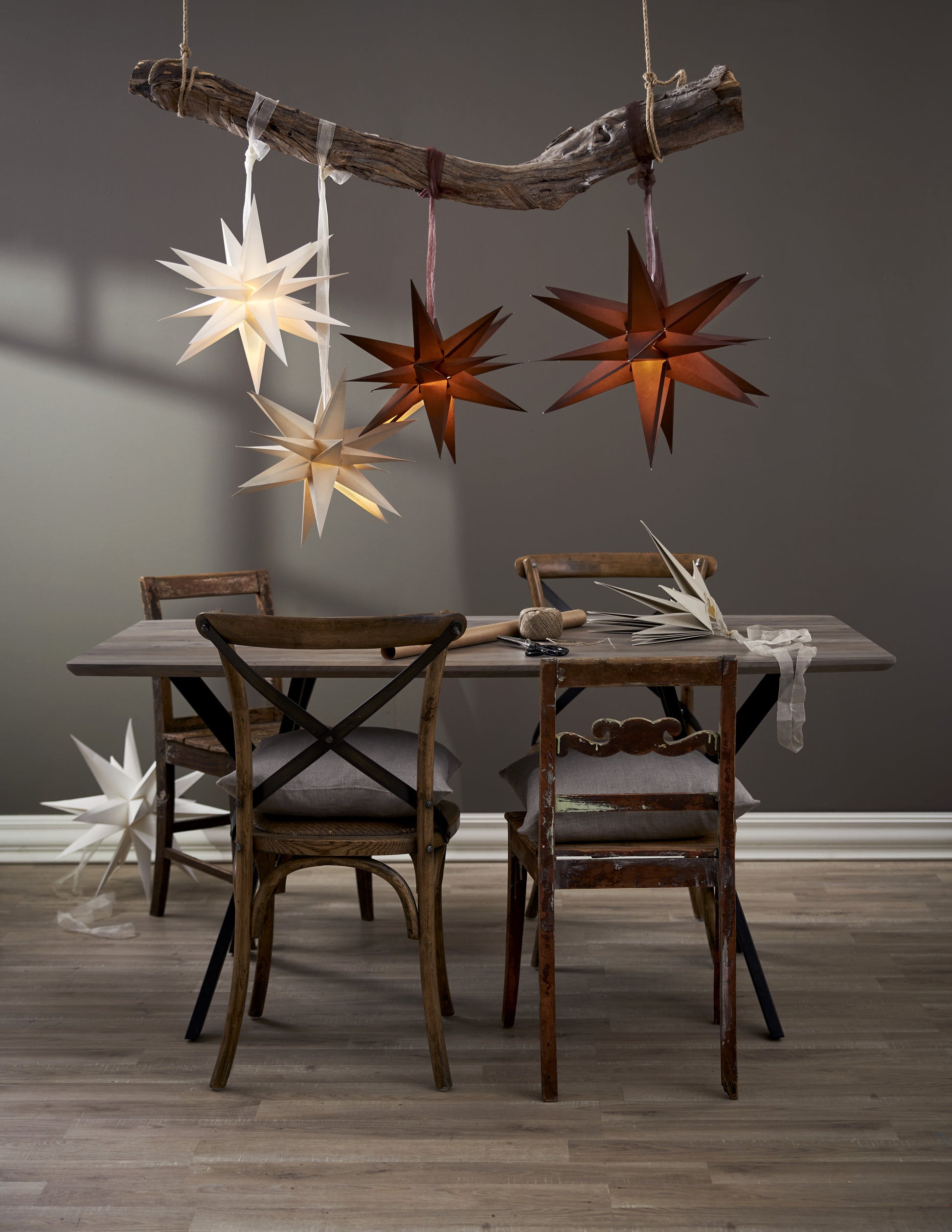 Beigefarbener Papierstern mit 18 Zacken, fantastische Weihnachtsdekoration über dem Tisch, einzeln oder mehrere zusammen. Mit Hilfe der Kordel und des Dekobandes leicht zu montieren. So wird Weihnachten zu etwas ganz besonderen